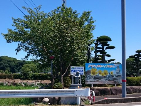 「まもるくん」が栖本駐在所のそばに立っています。交通安全を昼夜呼び方ています。近くに、ランドセル🎒を背負った河童像があります。