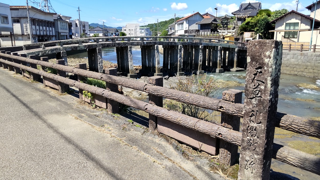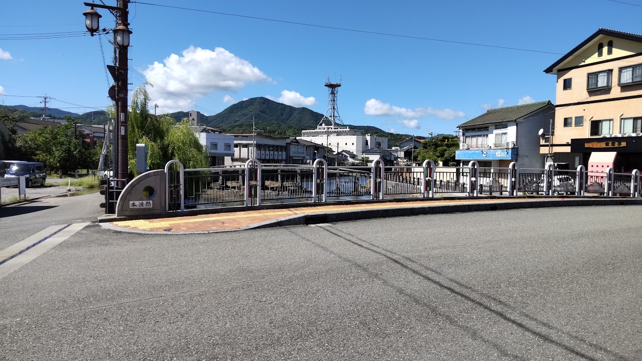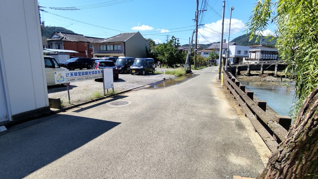 本渡から向かうと天草空港方面にあります。近くの信号機を渡ると本泉(もといずみ)橋があり、母がバス停へ走っていった場所はこちらだと思います。