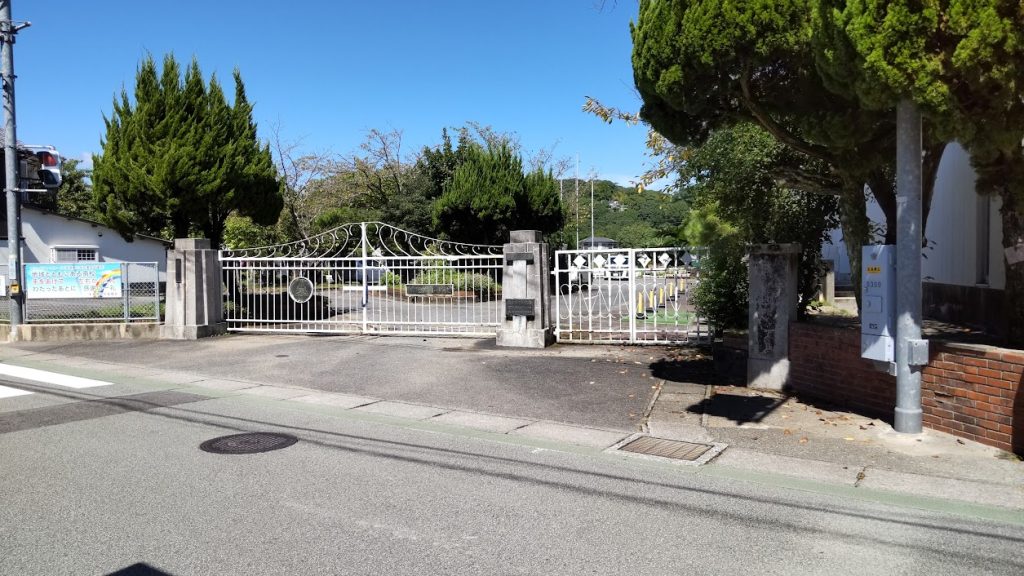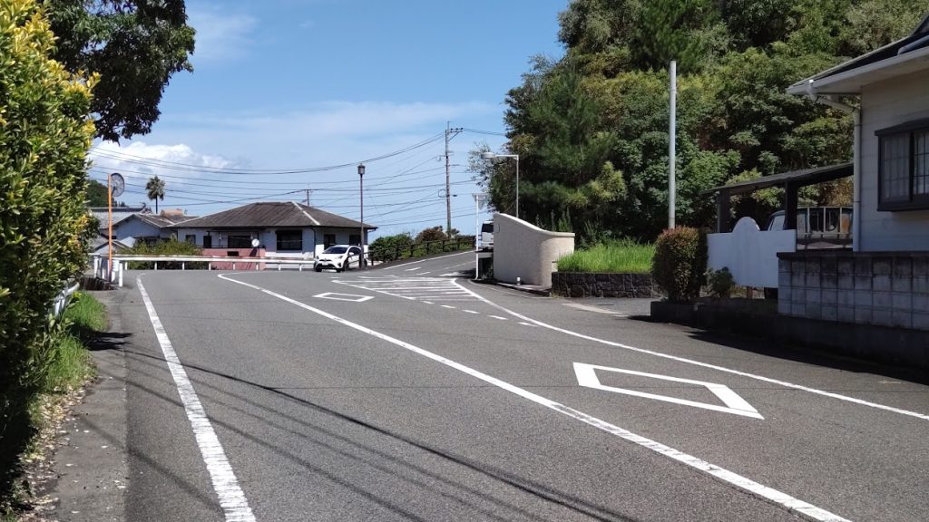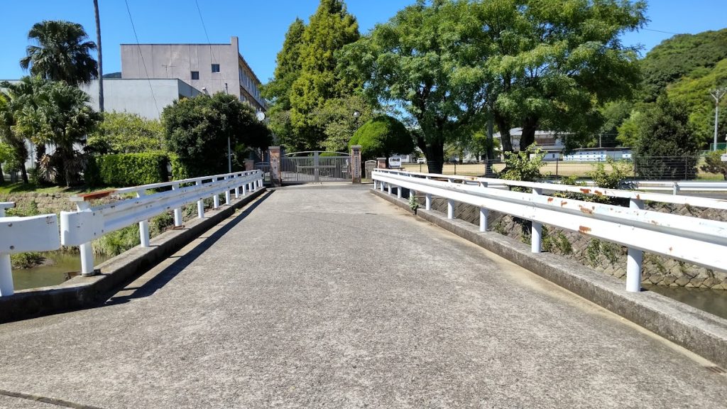 途中、とびだし注意の看板から左に曲がると本渡南小学校校門前に到着です。