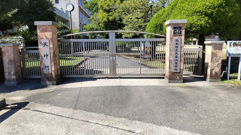 海咲の妹、七瀬は小学校の先生。校門前から妹へ電話する。天草高校校門前を正面に左の道沿いを進みますと、本渡南小学校が見えます。