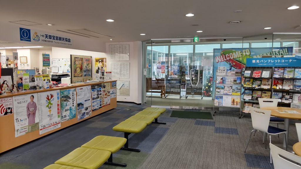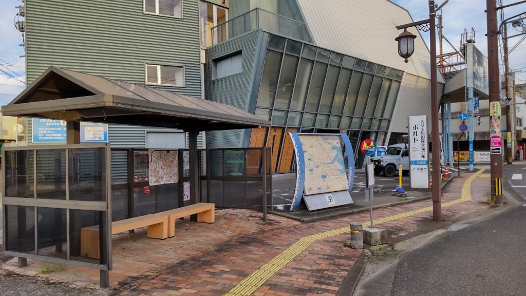 (海咲がフェリーからバスに乗り降りた場所。ポルトの1Fが当観光協会があります。パンフレットや観光協会手作りのトゥルーカラーズロケ地マップもございます。お気軽にお声掛け&お越しください!)