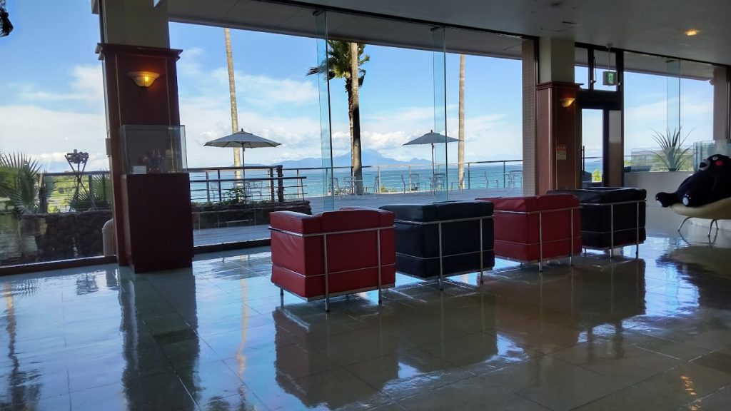 ホテルの中へ入ると・・・再会したフロントロビー、さらにテラスへ向かいます。テラスから見下ろすと本渡海水浴場が見えます。