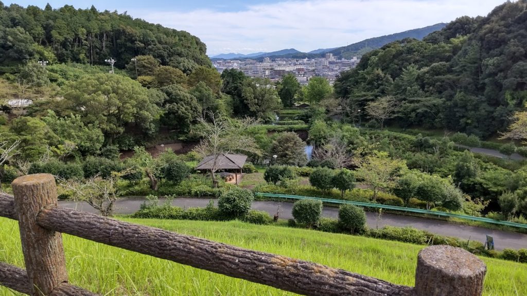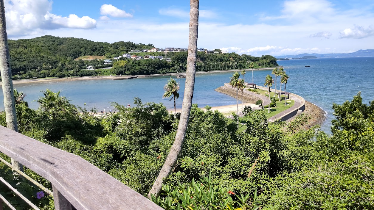 海咲が緑に囲まれた柵のある公園を歩き、本渡の街並みを見下ろす場面。ここからは車で移動です。