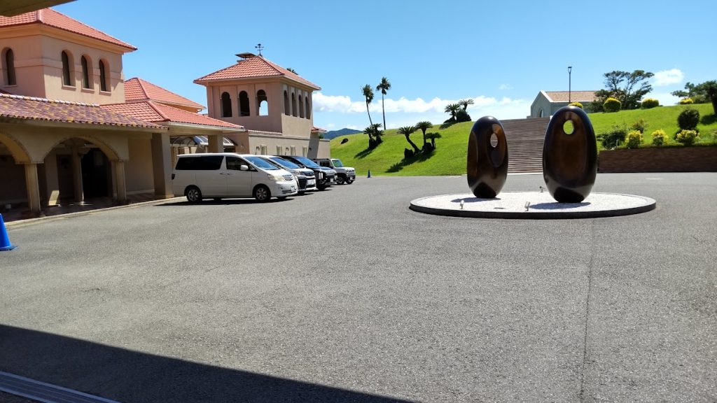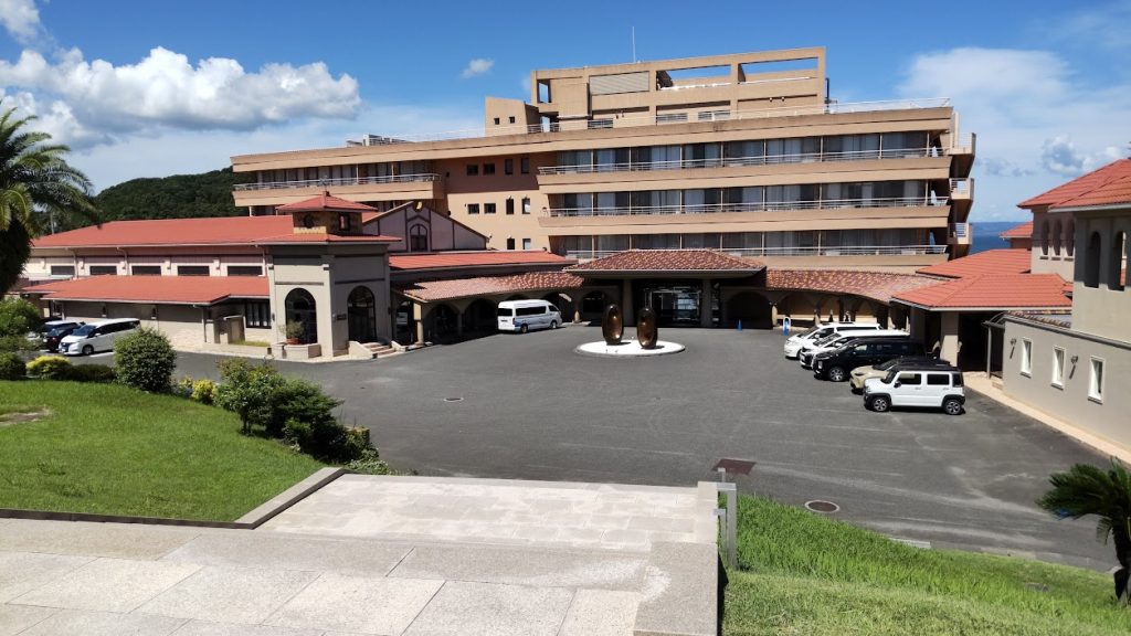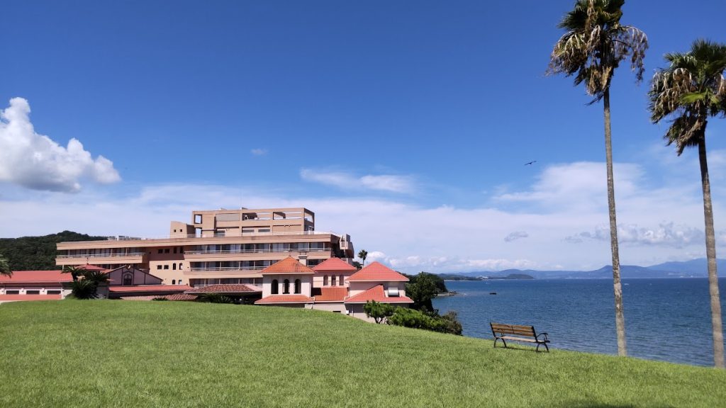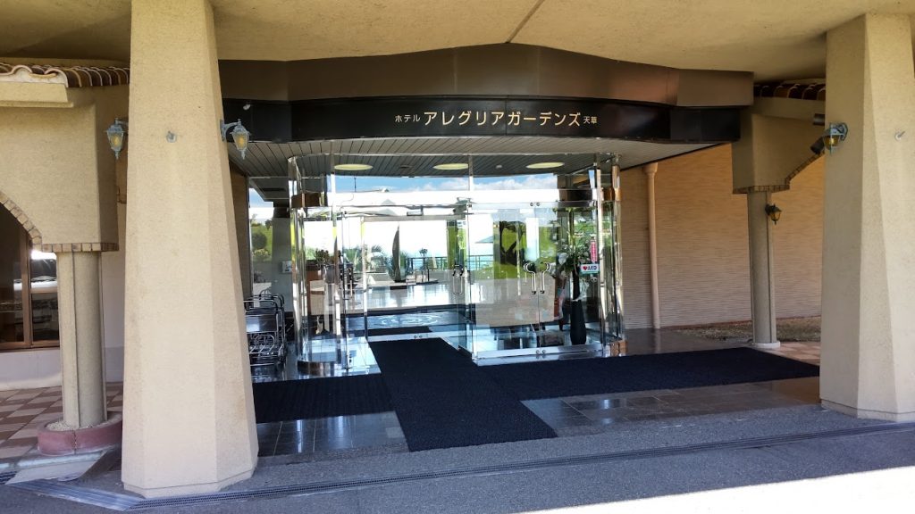 南国ならではのヤシの木々を通り抜けるとホテルアレグリアガーデンズ天草に到着です。)