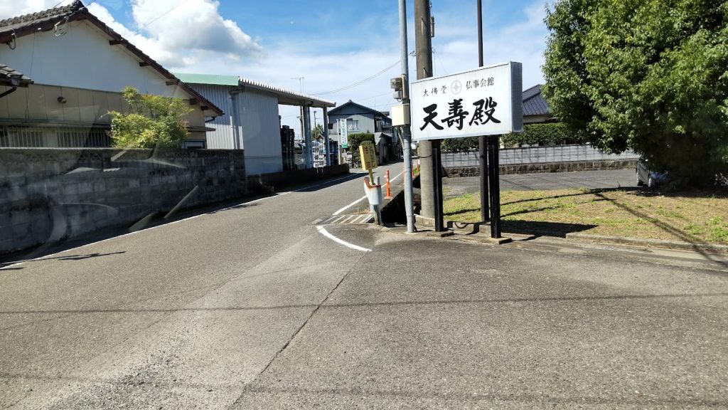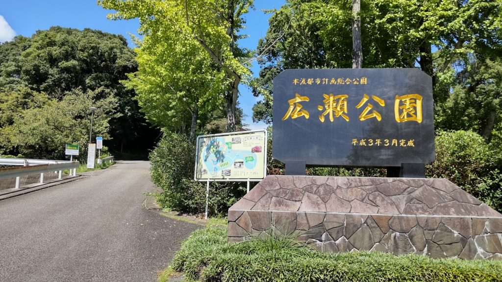 斎場「天寿殿」(てんじゅでん)をめざして行きます。天寿殿の看板が見えたら右折。左側に広瀬公園の入口があります。公園入り口にも駐車場ありますが、そのまま車で進めます。(下記写真の地図参照)