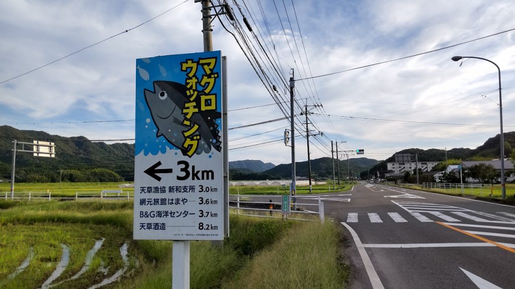 本渡から324号線を新和町方面へ車で30分ほど。途中左手に「マグロウォッチング」の看板を