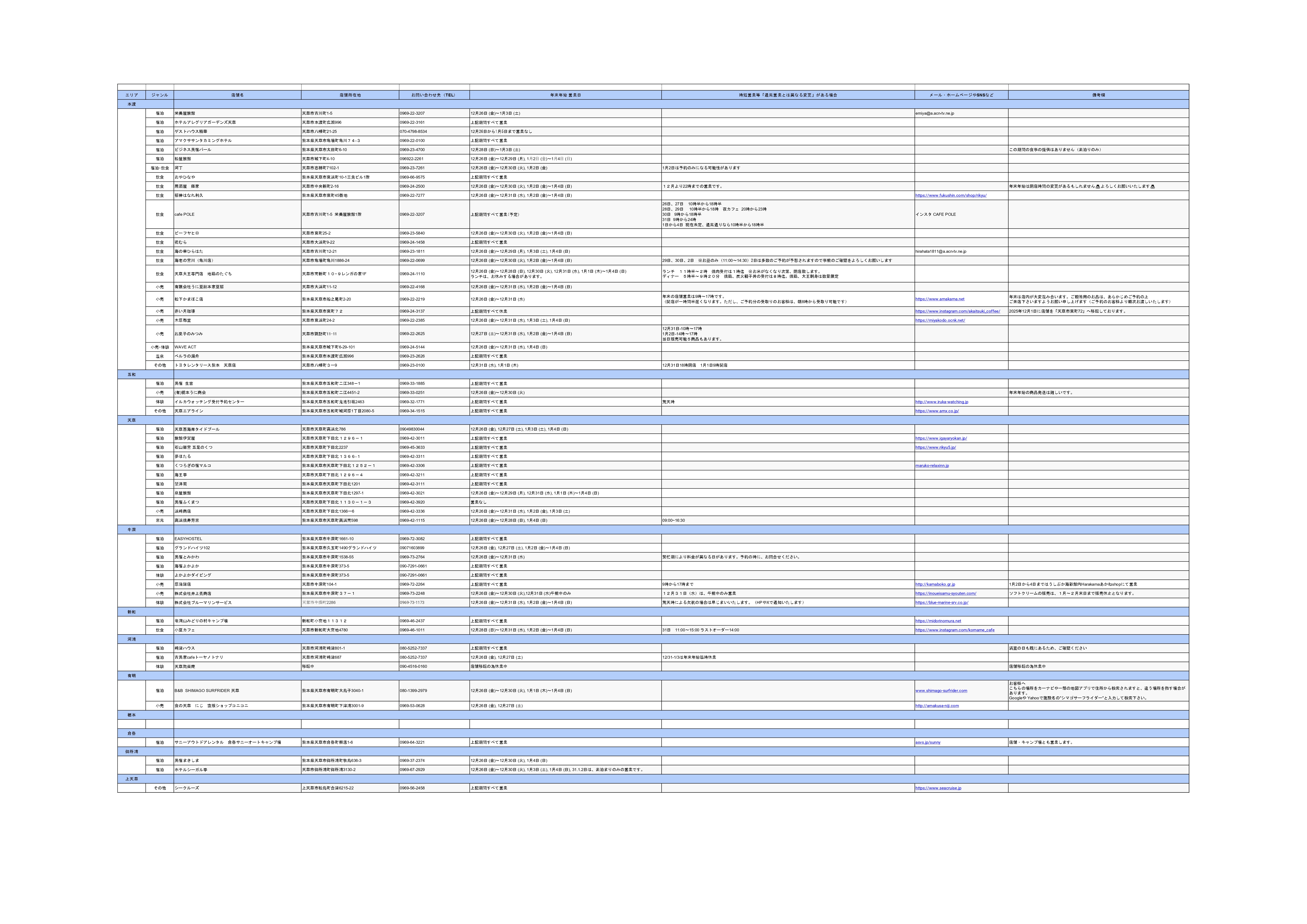 2025年12月26日~2026年1月4日までの年末年始の各店舗の営業情報一覧です。