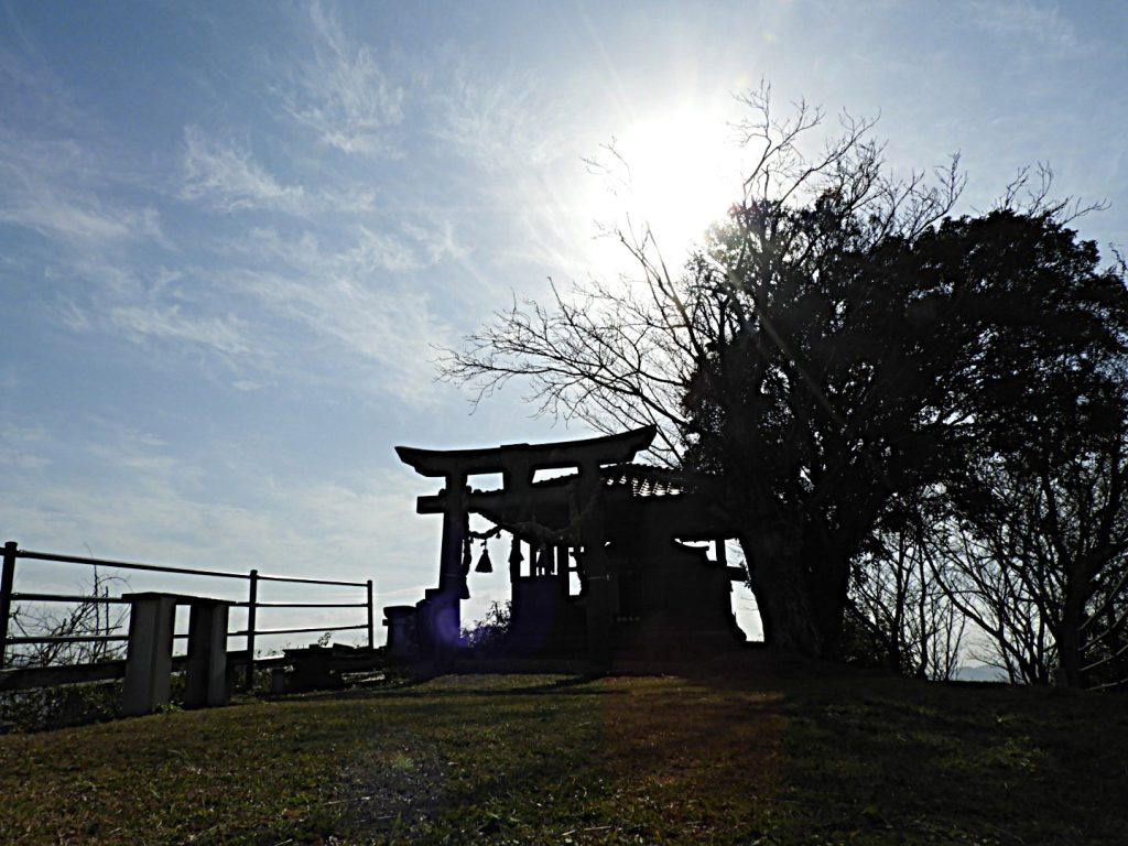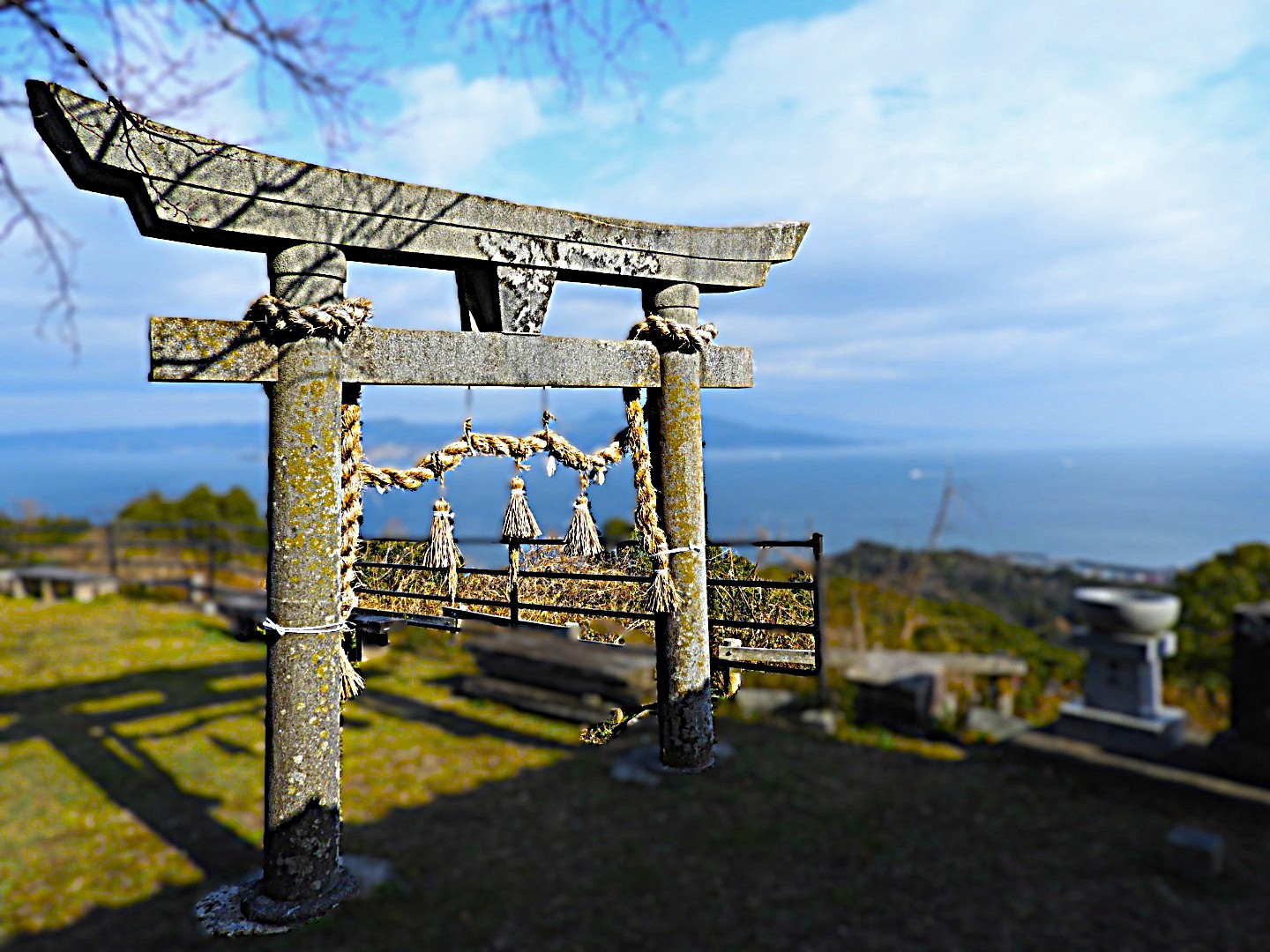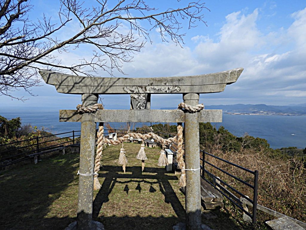 山頂に辿り着くと、まず目を引くのが歴史を感じさせる石造りの鳥居です。 鳥居の向こう側には遮るものがなく、まるで**「天空の鳥居」**のように、美しい有明海と空が広がります。