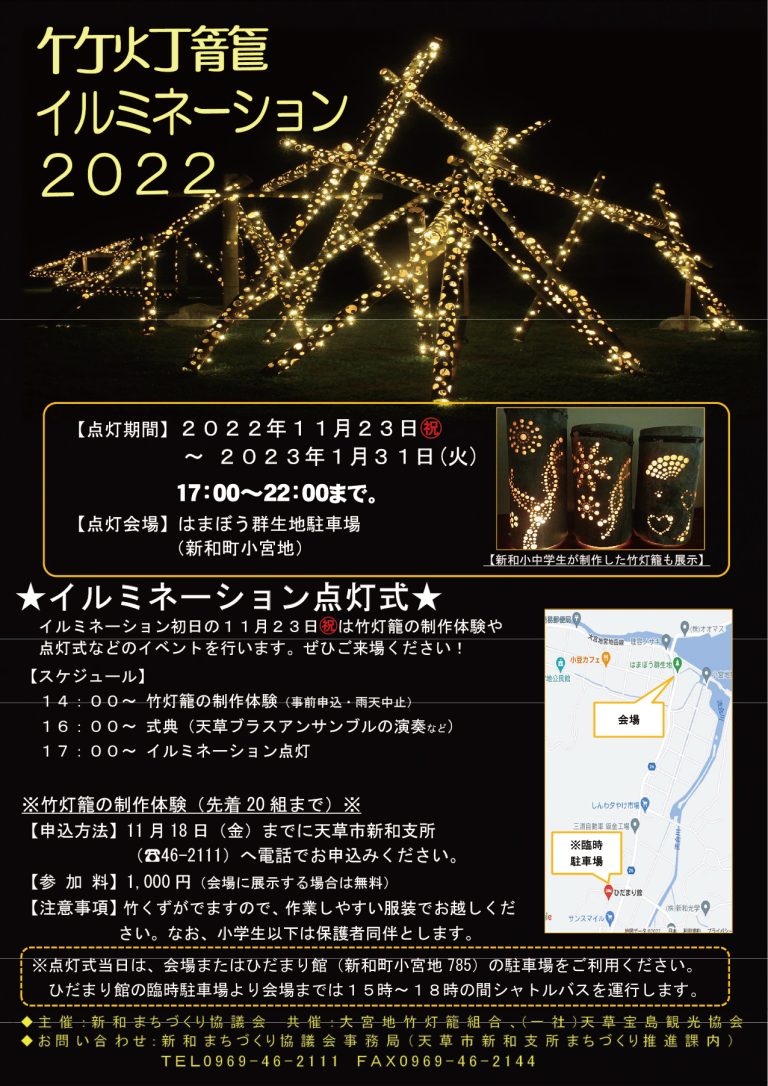 ・点灯式当日は、会場またはひだまり館(天草市新和町小宮地785)の駐車場をご利用下さい。