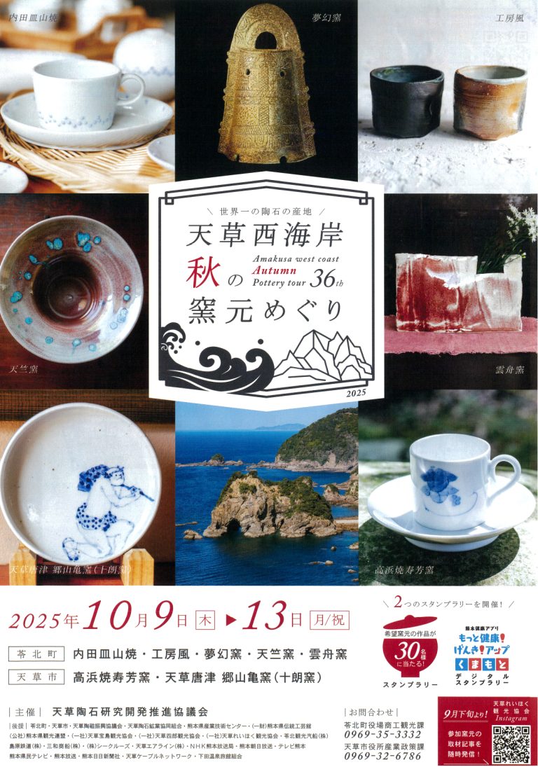天草市天草町および天草郡苓北町の各窯元では、良質な天草陶石を使った透明感のある純白の作品や、木灰釉の温かみのある作品といった伝統を守りつつ、消費者の趣向を捉えた作品づくりに取り組んでおり、その成果発表の場として、毎年秋に「天草西海岸秋の窯元めぐり」を開催しています。