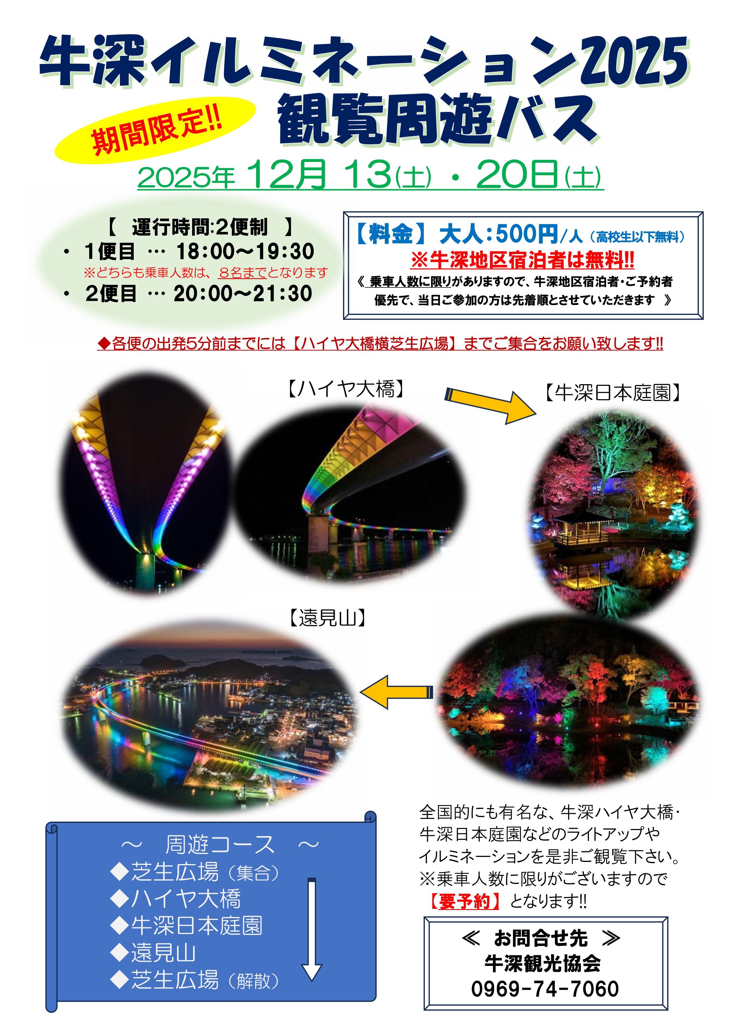 離れた会場に点在する牛深イルミネーションの各会場を巡る観覧周遊バスを期間限定で運行します。