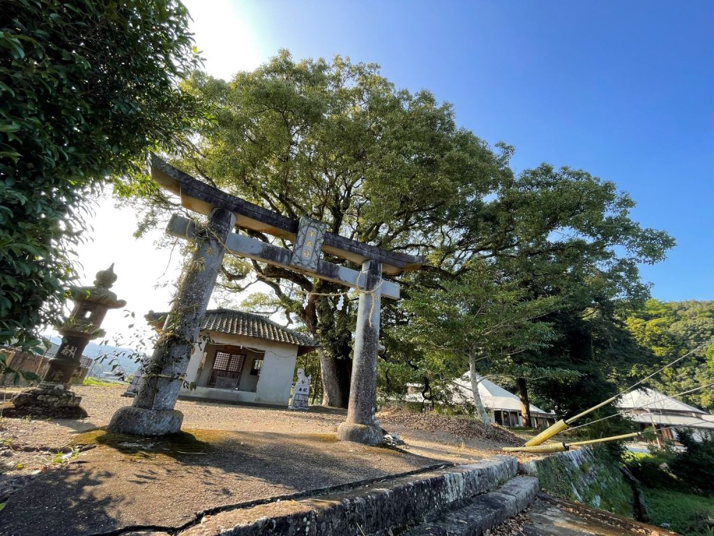 上野原神社の大楠、高さ約20m、幹回り7m、天草屈指の大楠。樹齢約500年といわれ、昔から神木としてあがめられています。※天草市景観重要樹木。