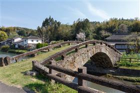 楠浦(くすうら)の眼鏡橋と似た形状で、橋長約22m、幅約3mとなっています。石材も衹園橋(ぎおんばし)などと同じく、天草産の砂岩である下浦石です。アーチ式の石積みには蔓(かずら)がからみ、見るからに古めかしく優美な姿を川面に映しています。