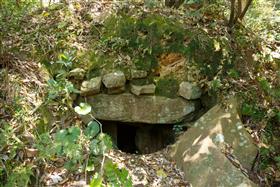 西南部に羨門(せんもん)をかまえた横穴式石室の円墳で、玄室は長さ2.2m、幅2.2m、天井高2.5mとなっています。下部を一枚岩の巨岩で組み、丸天井で、奥壁には棚のような造り出しがあります。古墳時代後期(約1,400年前)のものと推定されます。
